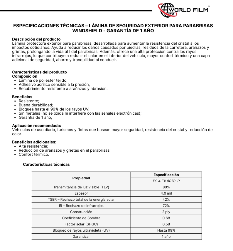 WindShield es una película protectora externa para parabrisas, desarrollada para aumentar la resistencia del cristal a los impactos cotidianos.